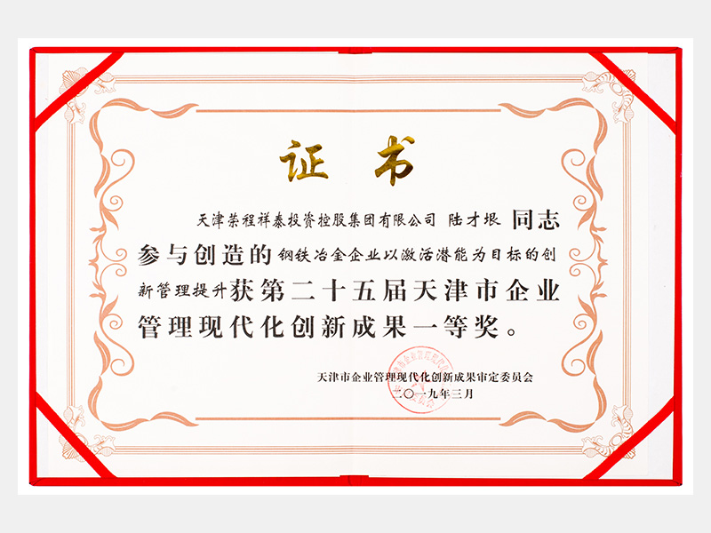 陸才垠同志參與創(chuàng)造的鋼鐵冶金企業(yè)以激活潛能為目標的創(chuàng)新管理提升獲第二十五屆天津市企業(yè)管理現(xiàn)代化創(chuàng)新成果一等獎。