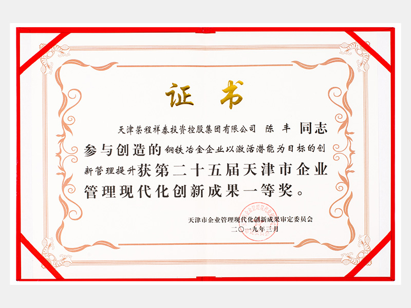 陳豐同志參與創(chuàng)造的鋼鐵冶金企業(yè)以激活潛能為目標(biāo)的創(chuàng)新管理提升獲第二十五屆天津市企業(yè)管理現(xiàn)代化創(chuàng)新成果一等獎(jiǎng)。